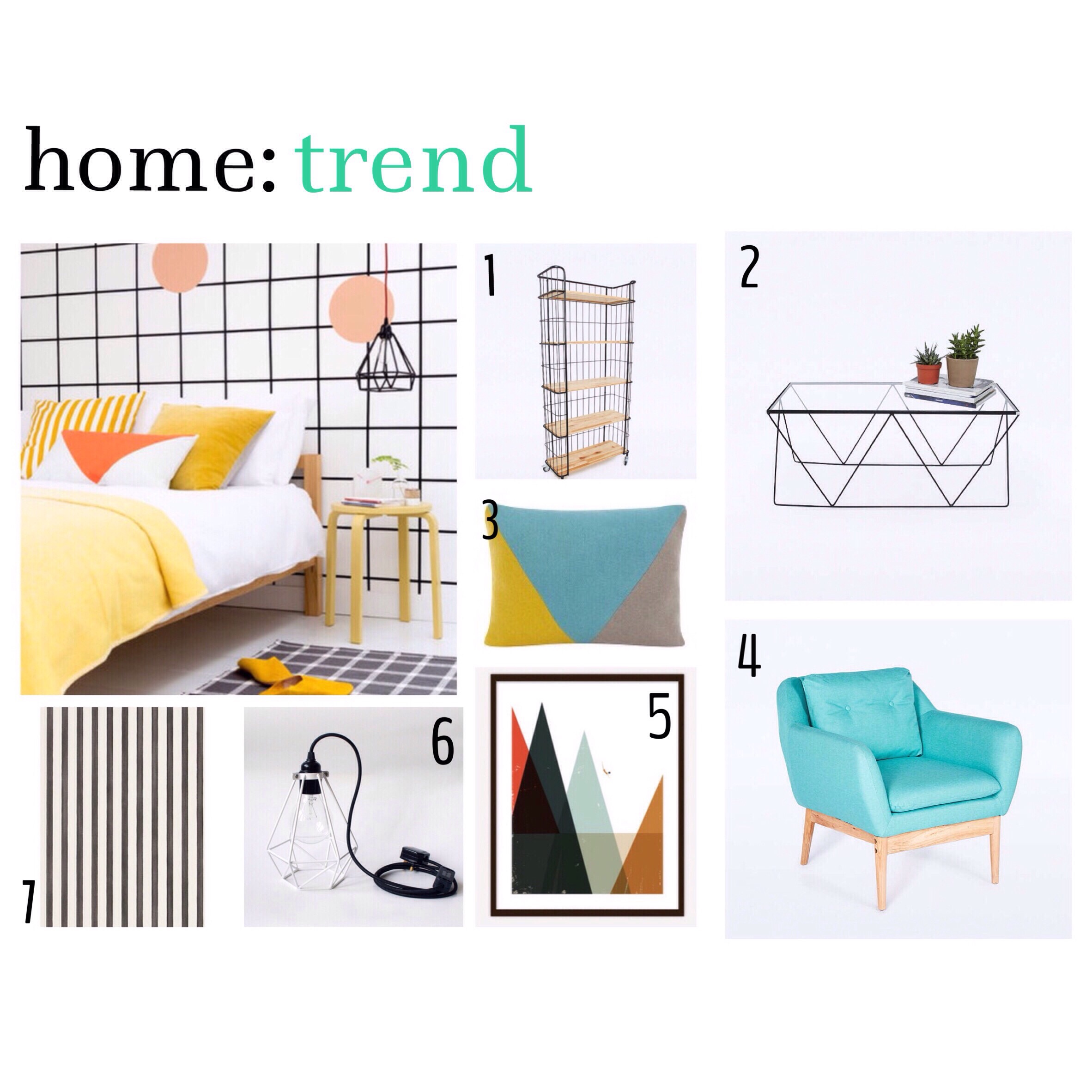 Search for grid pattern wall papers ( try Ferm Living ), big geometric patterns on soft furnishings from brands including Next, Zazzle and John Lewis, and colourful bold items of furniture that will sit against a monochrome backdrop. Head to Made for a huge selection of bright stand alone pieces of furniture at great prices.