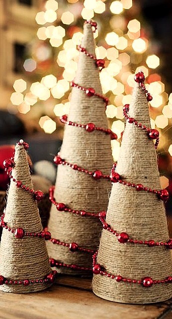 Cut and stick cardboard into cone shapes, coat in PVA glue and wind sparkly twine or string round, ensuring not to leave any gaps to produce modern, simple statement Christmas trees. Again these would look great in varied sizes and clustered together.