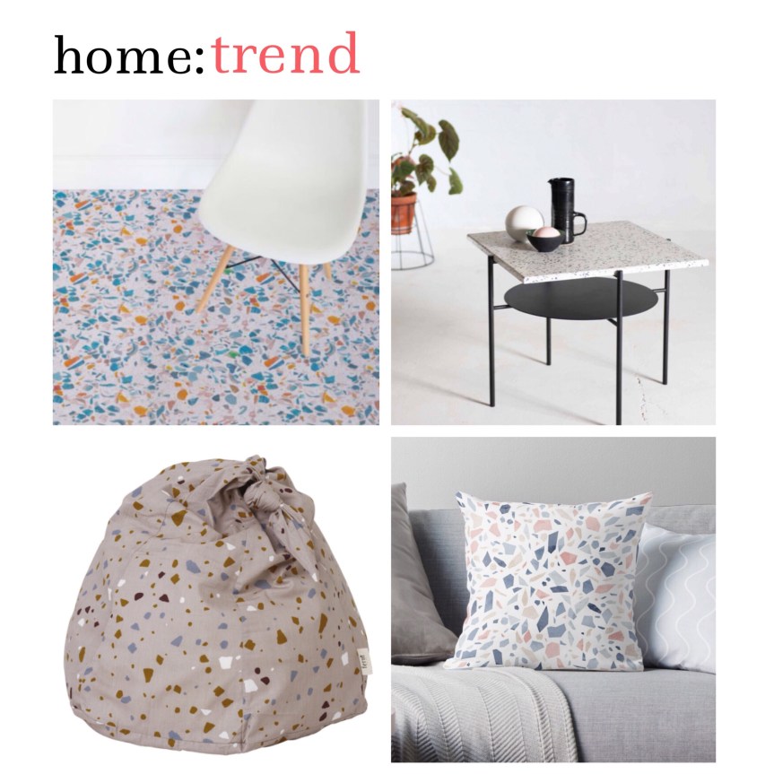 Across the internet and highstreet the terrazzo pattern in various colours is appearing on anything from crockery to cushions, bean bags to coffee tables.