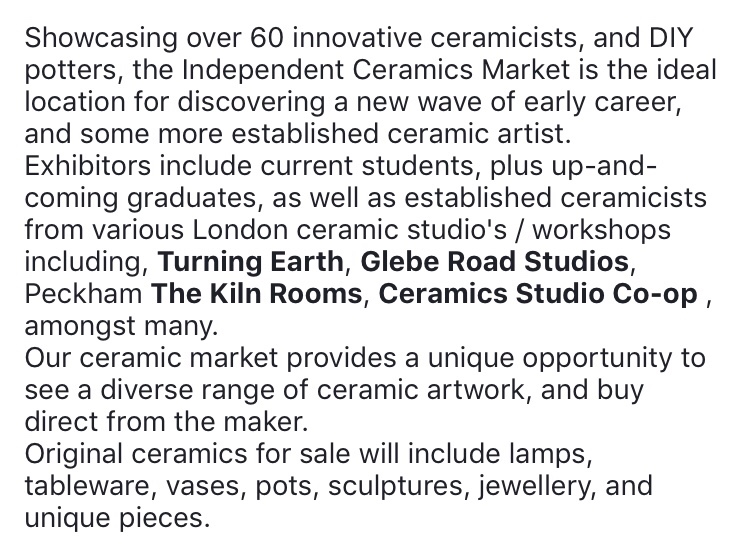 home: event [ ceramics market ] It may be too late for this weekends Independent Ceramics Market in London but get the date in your diary for the next one – June 3rd At 133 Copeland Road SE15 3SN London They say ; Share this: Click to share on X (Opens in new window) X Click to share on Facebook (Opens in new window) Facebook Like Loading...