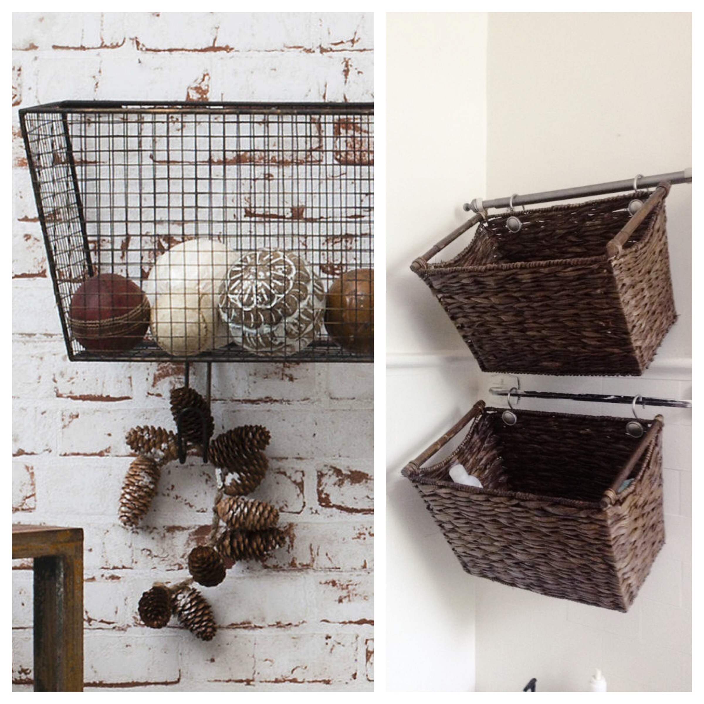 Explore EBay, Not On The Highstreet and Amazon for cool modern metal baskets, vintage style aged baskets, woven baskets and old, or made to look worn, crates for effective storage that can hang from hooks.