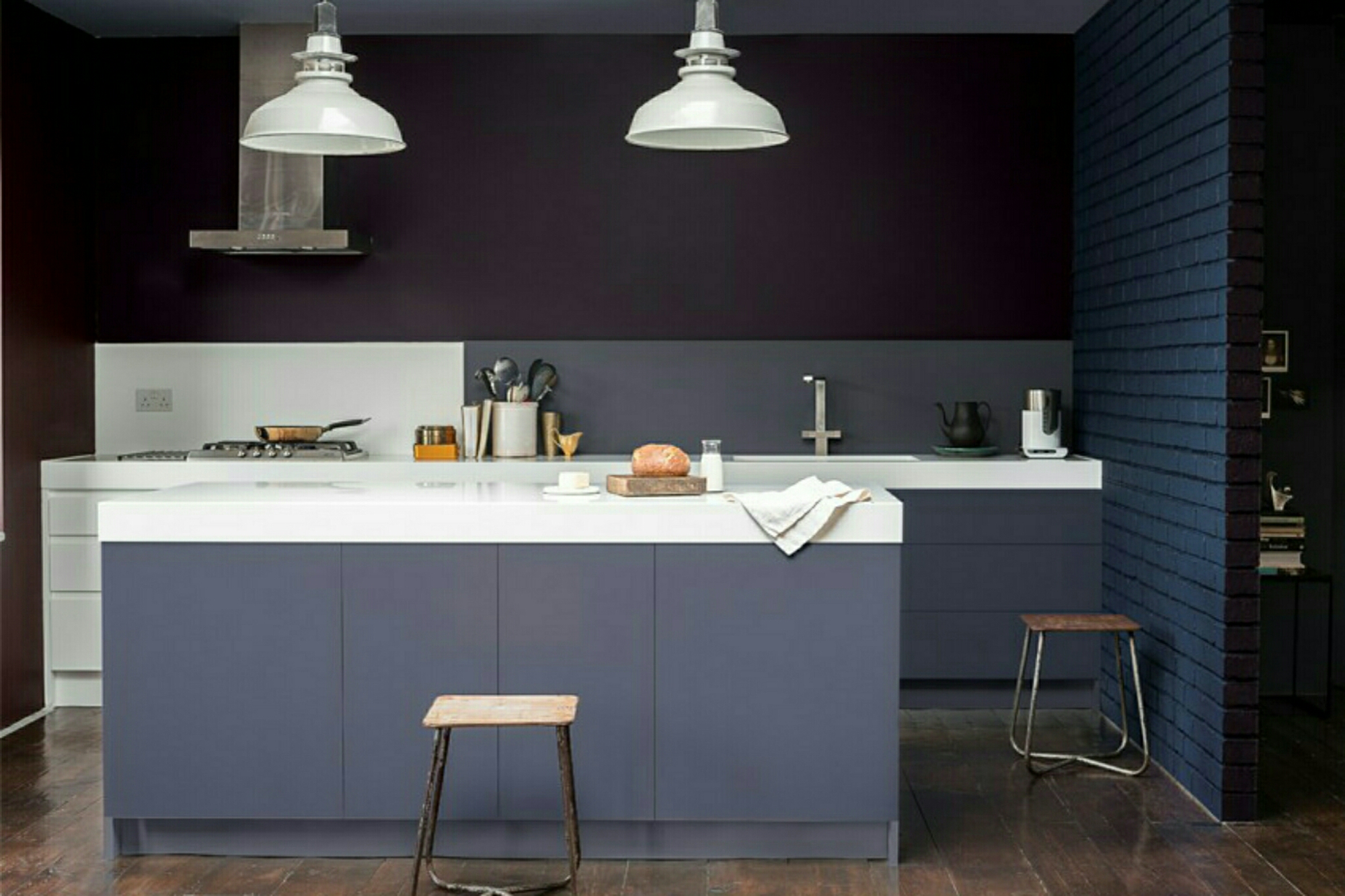 If it’s a kitchen then use the units and worktops to block the colour, creating a very clean minimal look. [ see pic above ]