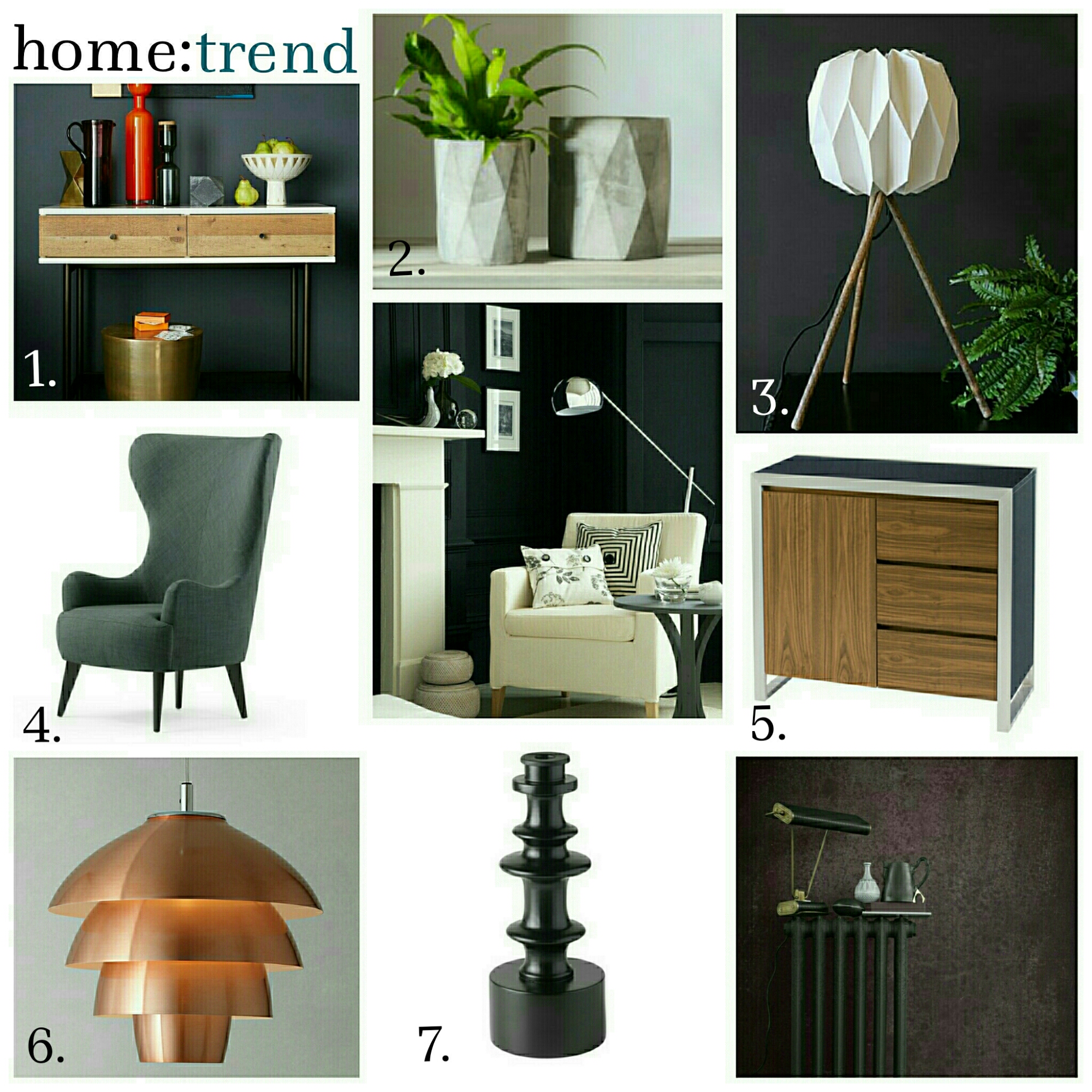 This trend will create a calming space, with the dark colours on the walls [ pick one or two ]. Add black accessories and dark wood furniture in parts of the room to emphasise the shades, and lift other areas with white and copper tones. [ candlesticks, vases, lamps and picture frames work great ]