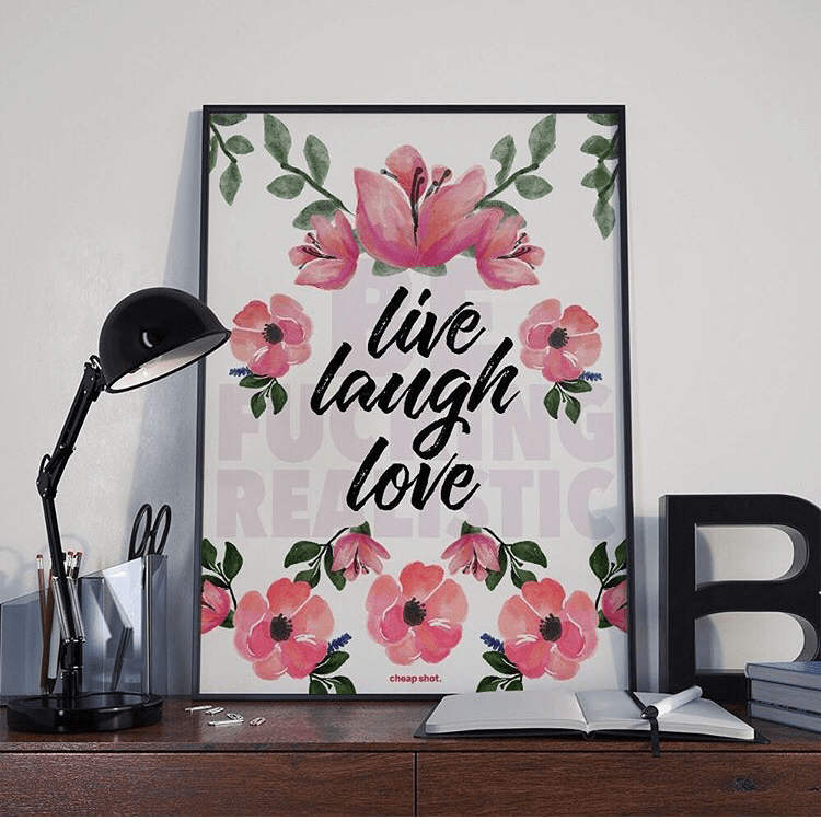 We must congratulate the folks at CheapShot for succeeding with their crowd funding to launch their creative (and wittily sarcastic) new print brand. Their prints (and cards) are on the surface a pretty mix of flora and typography with a meaningful quote but look a little closer and realise the amusing full design of the prints with their witty undertone cleverly and discreetly written behind the main quote.