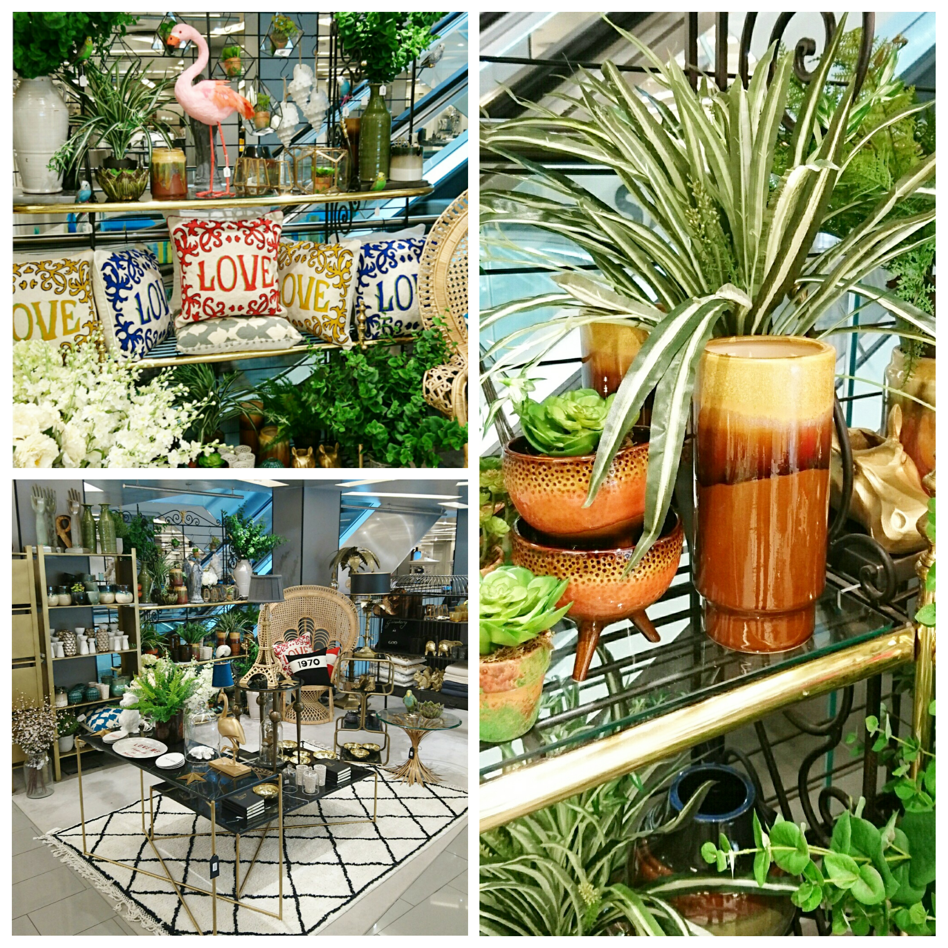 In the second space it’s all about faux flowers, ceramics and planters; take your pick from faux roses, peonies, chrysanthemum and more. Browse the stunning selection of vases and planters, as well as geometric terrariums perfect for cacti and small plants. All this set amongst gold ornaments, bird foot candle holders, flamingo lamps and animal money boxes, you are in for a real treat.