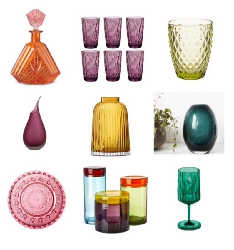 Glassware is no longer boring. If you are looking to update your collection,then go for something colourful. Jewel tones have been big this year and we are both fans of this.