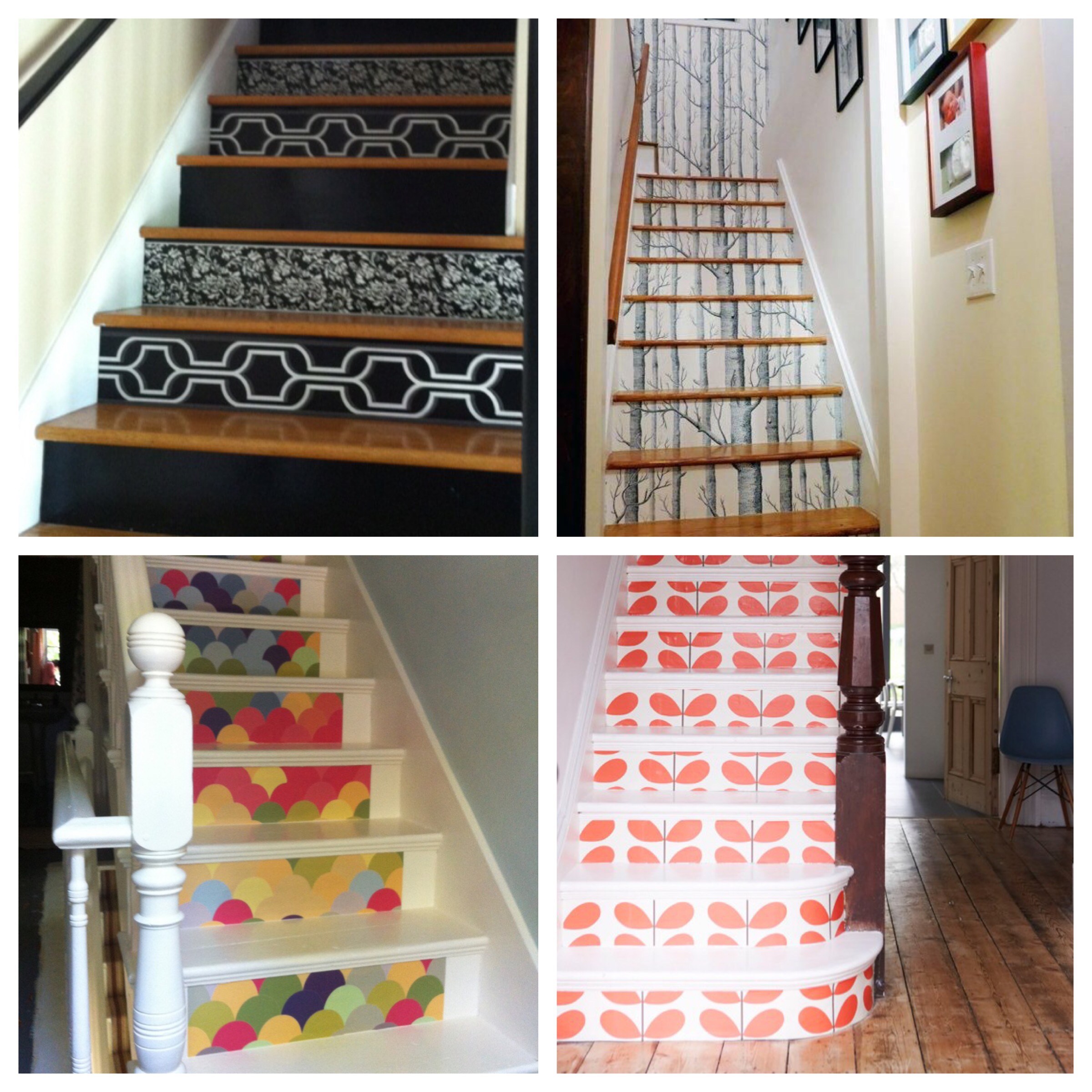 The important thing to start with is a well prepped set of stairs. It’s essential to sand down to a smooth finish, removing any nails, sharp points and excess old paint, and give a good clean to ensure a good surface to work on. Treads should be primed next, to give a good layer for the chosen paint to go on to. Priming can also help even if using wallpaper as it can help to make a smoother surface under the paper. It is key to apply a few thin layers, fully dried in between to create a solid, long lasting finish with paint and with wallpaper the same with clear varnish.